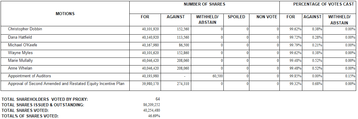 At the meeting, the six nominees to the Company’s Board of Directors, Chris Dobbin, Wayne Myles, Michael O’Keefe, Dana Hatfield, Marie Mullally and Anne Whelan, were elected for the ensuing year. Grant Thornton LLP was re-appointed as the Company’s auditor to hold office until the next annual meeting of shareholders or until its successor is duly appointed, at a remuneration to be fixed by the Board.