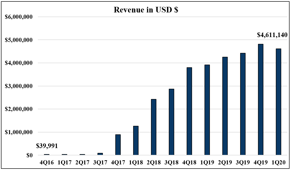 - Q1 2020 revenues of $4,611,140 were 17.9% higher than Q1 2019 revenues of $3,911,855 and 4.3% lower than Q4 2019 revenues of $4,818,729. The lower revenues in Q1 2020 as compared to Q4 2019 is primarily the result of the preliminary impact of COVID-19 for the latter part of March 2020.