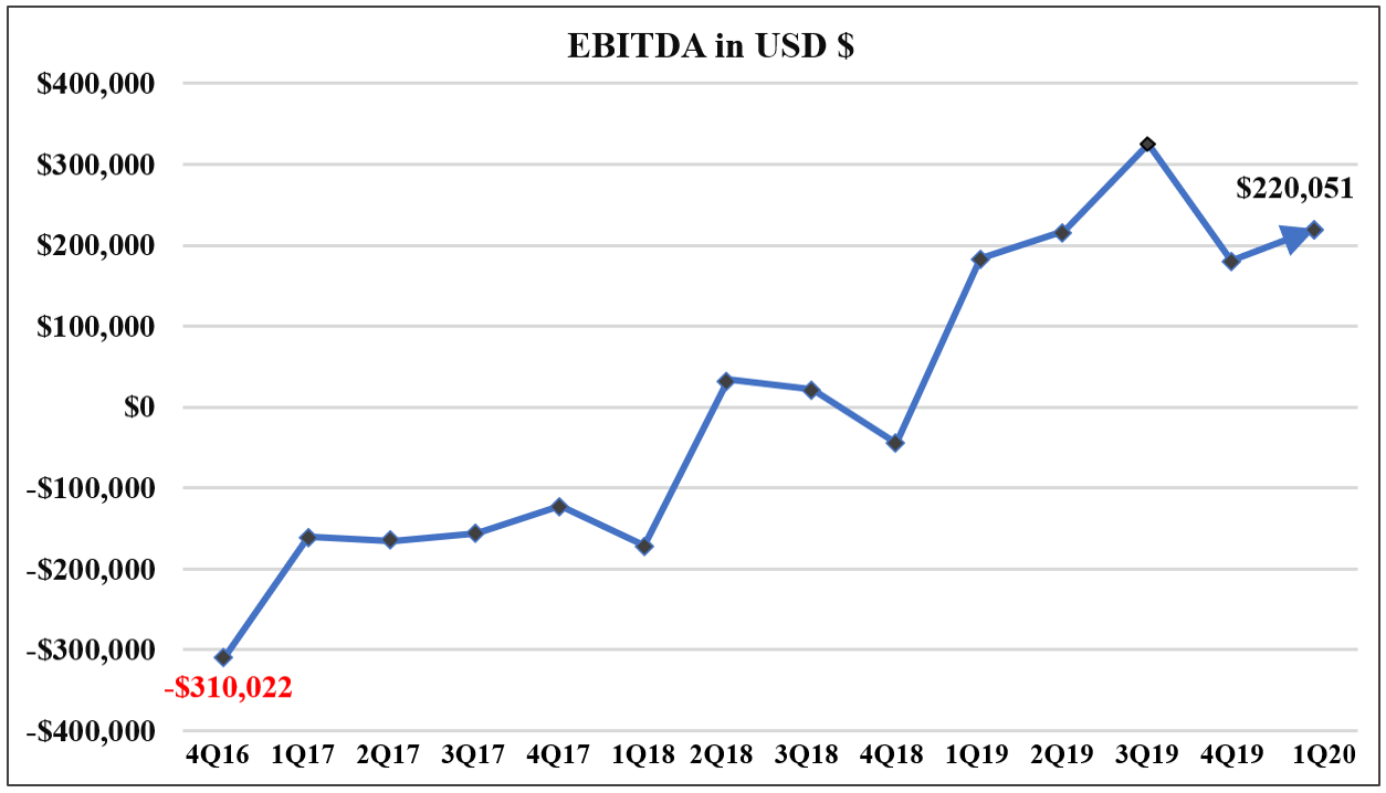 - Q1 2020 EBITDA of $220,051 was 20.0% higher than Q1 2019 EBITDA of $183,376 and 21.1% higher than Q4 2019 EBITDA of $181,660.