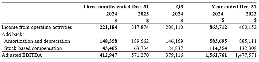 - Q4 2024 Adjusted EBITDA of $412,947 was an increase of 8.9% over Q3 2024 Adjusted EBITDA of $379,116. (see calculation of Adjusted EBITDA below).