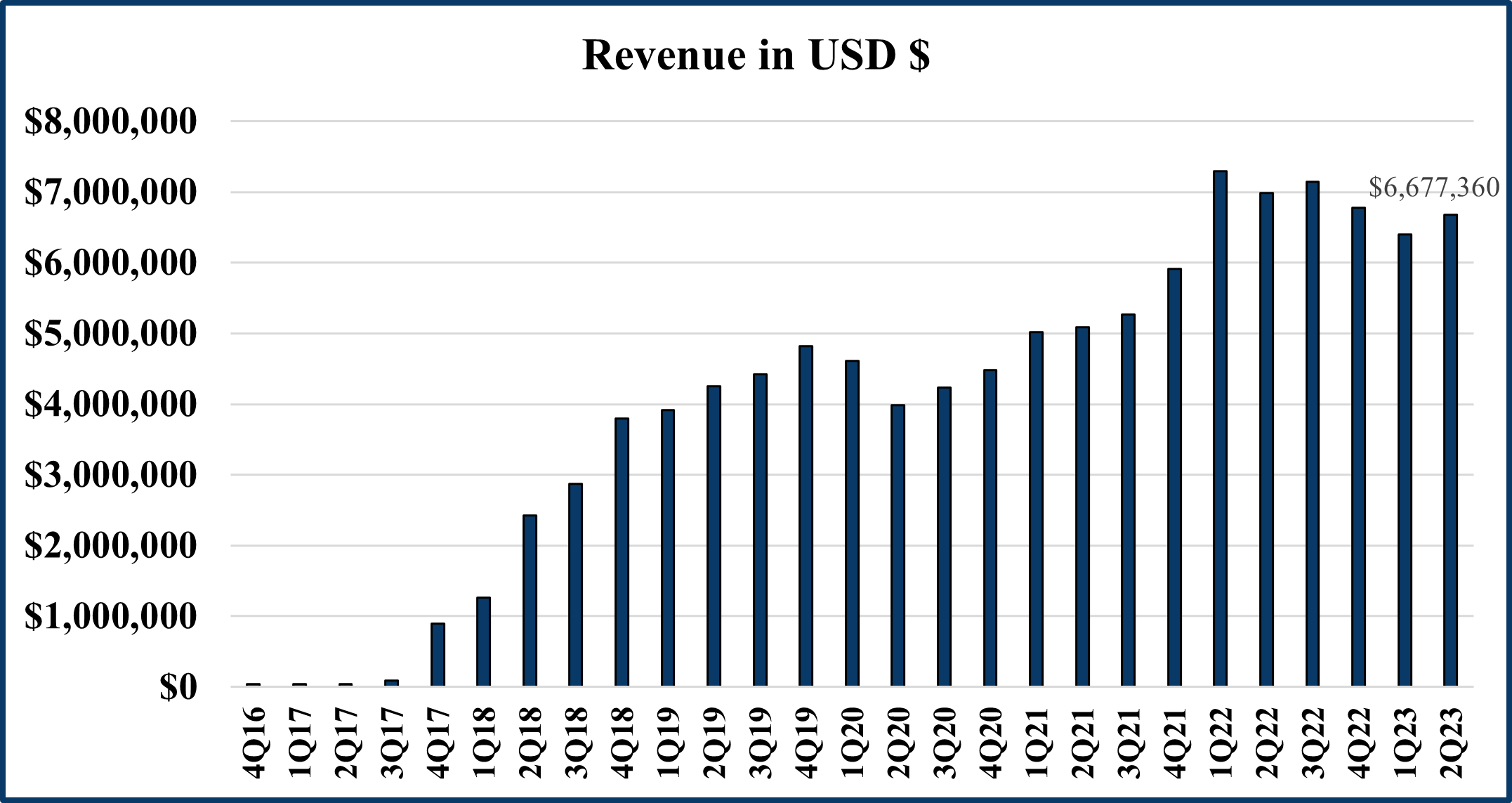 - Q2 2023 revenues of $6,677,360 increased by 4.4% relative to Q1 2023 revenues of $6,396,076 and were lower than Q2 2022 revenues of $6,986,758 by 4.4%.
