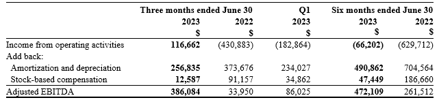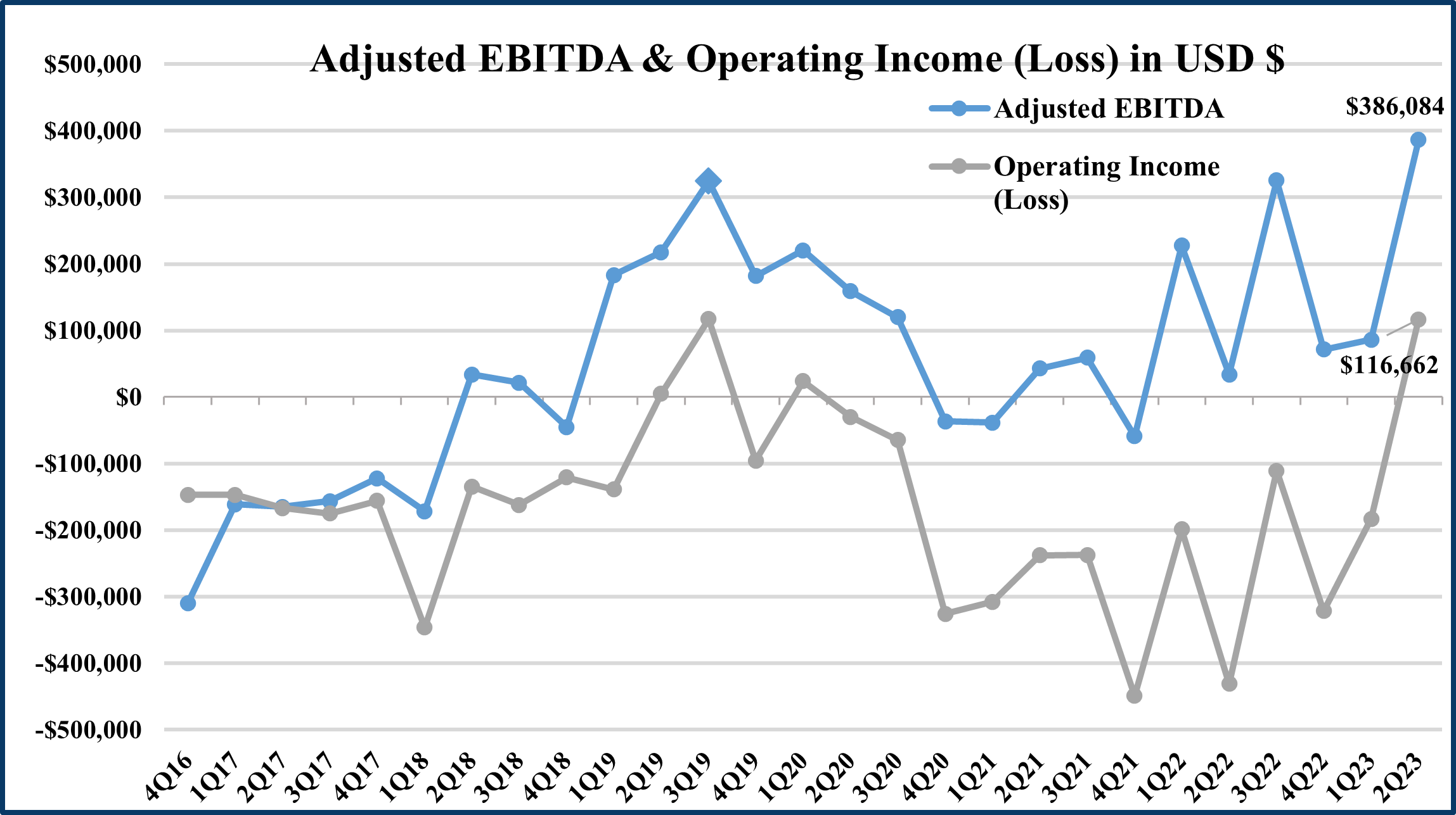 - Q2 2023 Adjusted EBITDA of $386,084 was 4.5X higher than Q1 2023 Adjusted EBITDA of $86,025 and 11.4X higher than Q2 2022 Adjusted EBITDA of $33,950 (see calculation of Adjusted EBITDA below).