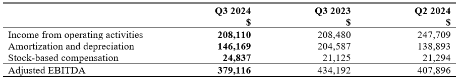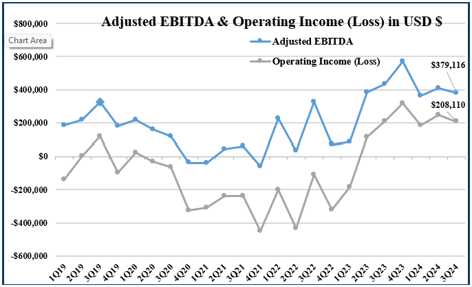 - Q3 2024 Adjusted EBITDA of $379,116 was a decrease of 7.1% over Q2 2024 Adjusted EBITDA of $407,896 and 12.7% over Q3 2023 Adjusted EBITDA of $434,192 (see calculation of Adjusted EBITDA below).