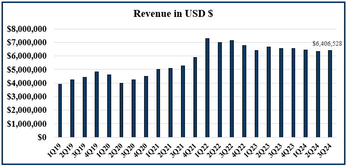 - Q3 2024 revenues of $6,406,528 increased by 1.1% relative to Q2 2024 revenues of $6,338,532 and decreased by 2.2% relative to Q3 2023 revenues of $6,553,724.