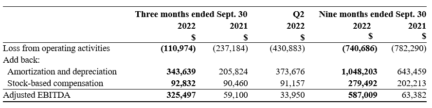 - Q3 2022 Adjusted EBITDA increased to $325,497 from $33,950 in Q2 2022 and $59,100 in Q3 2021 (see calculation of Adjusted EBITDA below);
