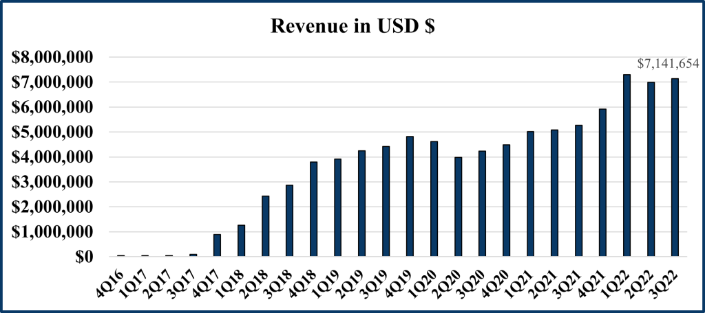 - Q3 2022 revenues of $7,141,654 increased by 2.2% relative to Q2 2022 revenues of $6,986,758 and were 35.7% higher than Q3 2021 revenues of $5,263,242;