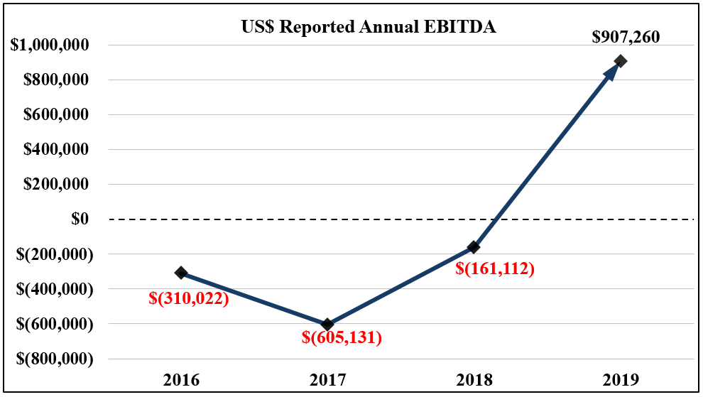 - Quarterly EBITDA of $181,660 in Q4 2019 was an increase of 503% over Q4 2018 EBITDA of ($45,075) and a decrease from Q3 2019 record EBITDA of $324,676;