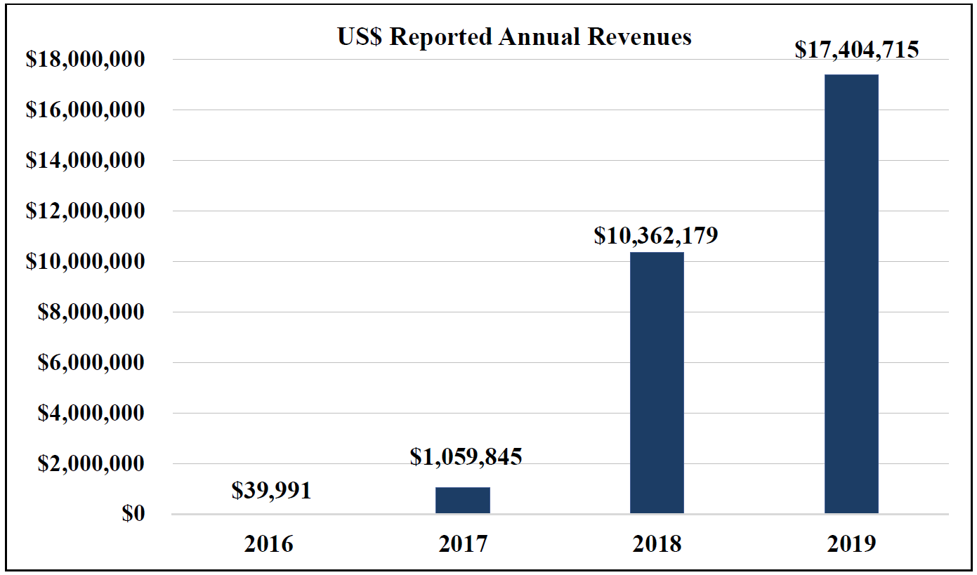 - Achieved Q4 2019 revenues of $4,818,729, an increase of 8.9% over Q3 2019 revenues of $4,424,350 and an increase of 26.8% over Q4 2018 revenues of $3,801,082;